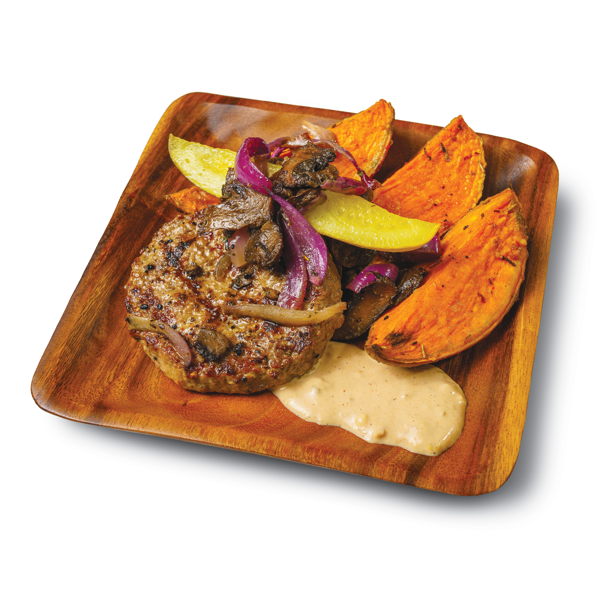 This Mushroomy Beefy Burger Stack is a gluten-free sensation that promises a flavorful journey with each bite. Crafted with premium ground black angus, served with fresh mushrooms and crispy sweet potatoes.